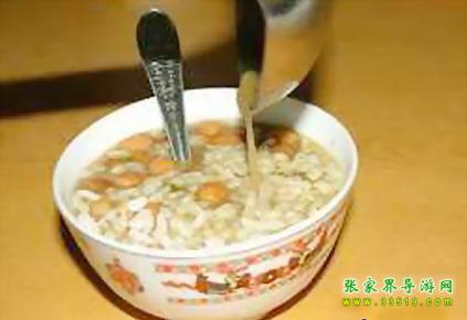 油茶湯對土家族人來說一日三餐少不了。土家油茶湯是張家界土家族具有代表性的包含文化現(xiàn)象之一,土家語稱“色斯?jié)缮?rdquo;,堪稱中國茶文化一絕,源遠(yuǎn)流長。據(jù)清代的古書記載:“土人以油炸黃豆,包谷,米花,綠焦諸物,取水和油,煮茶葉和湯泡之,餉客致敬,名曰:‘油茶’”。
