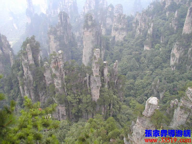 (神兵聚會(huì))從仙人橋去老屋場(chǎng),但見深谷里密密麻麻羅列上百座石峰,活像一群威武雄壯的將士列隊(duì)聽令,相傳這就是向王天子的神兵在聚會(huì)。神話雖不可靠,但石峰如此集中壯觀,在武陵源也屬罕見。我想引用一位美術(shù)大師的話:“豈有此理,莫名奇妙,說也不信,到此方知。”不看神兵聚會(huì),怎知石峰成林。
