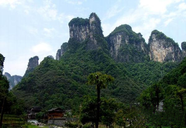 從玉鉆峰沿公路向北行2公里,但見溪谷兩岸石壁陡峭如削,高千仞,絕壁間石紋如畫,青白相間,加上有古木翠草點(diǎn)綴,如同畫屏。這就是“天門畫壁”。走過“天門畫壁”,便見三座石峰緊緊相連,這就是“相依巖”。高200余米,活象三個石人相依而立,靠前的一個是頭戴銀花首飾、身著百褶花羅裙的苗姑,緊靠后的一個是頭纏花帕、身穿對襟短衣的苗族男子,靠左的一個是頭纏絲帕、身著胸襟式土布衣的老媒人。
