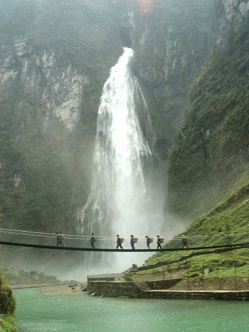 瀑水從斧削狀絕壁上的溶洞奪口噴出,飛流直下,聲如霹靂,數(shù)里可聞,整個山谷煙云彌漫,霧氣蒙蒙,遠看瀑布如白練懸空,近看似銀河瀉天際。每當陽光照耀時,五光十色的浪花似彩虹凌空飛舞,艷麗奪目,蔚為壯觀。瀑高214m,建有一電站。