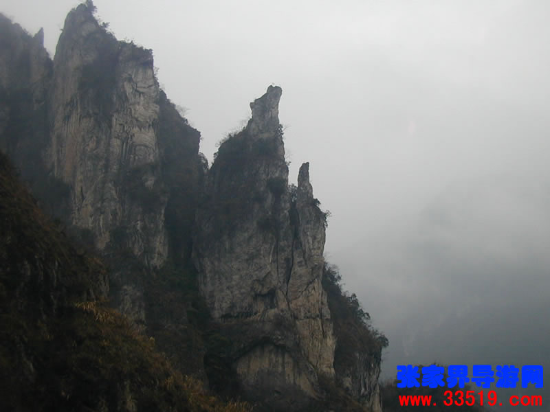 南天門——沿著河水一直往里走,在溪水最深處,可以仰望那隱藏在云霧里的南天門。它并不同于天門山的天門洞。它獨(dú)立于眾山之中,就像真正的通天大門,當(dāng)你翻過了前面的天門洞,卻還要再通過這座南天門,方可真正羽化登仙。南天門旁邊的幾座山峰,也都生的奇形怪狀,倒也天然形成了一個(gè)個(gè)大大小小的自然景觀。宛如天兵天將般守衛(wèi)南天門的將軍巖,象征南天門仙家氣息的蠟燭峰等,散落在四周,構(gòu)成了一個(gè)整體的山體奇觀。