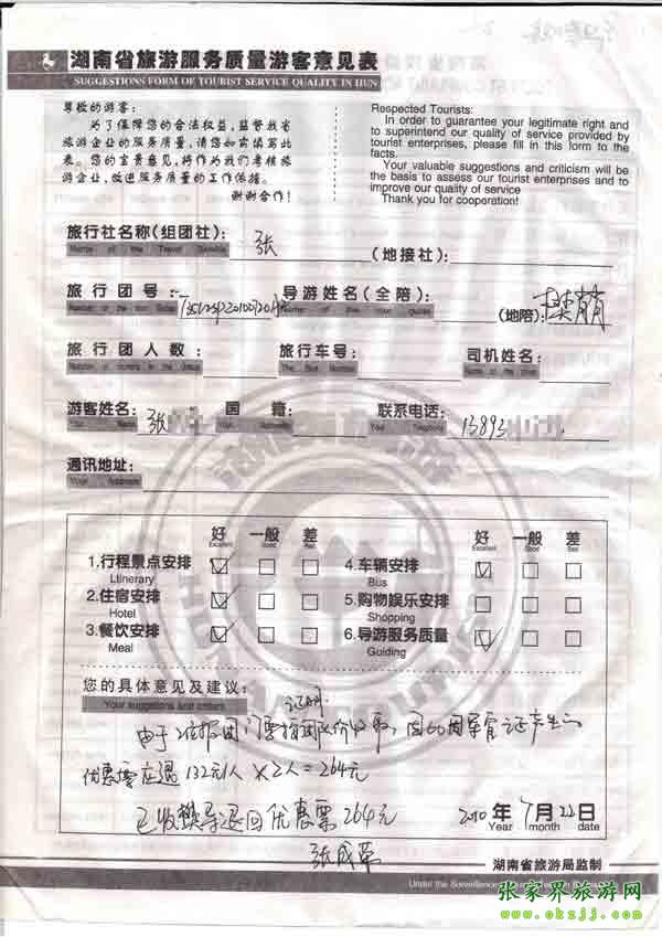 2010年7月22日張先生旅游質(zhì)量反饋