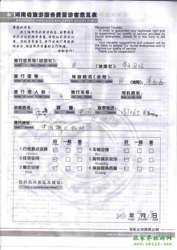 2010年9月19日何先生一行4位旅游質(zhì)量反饋